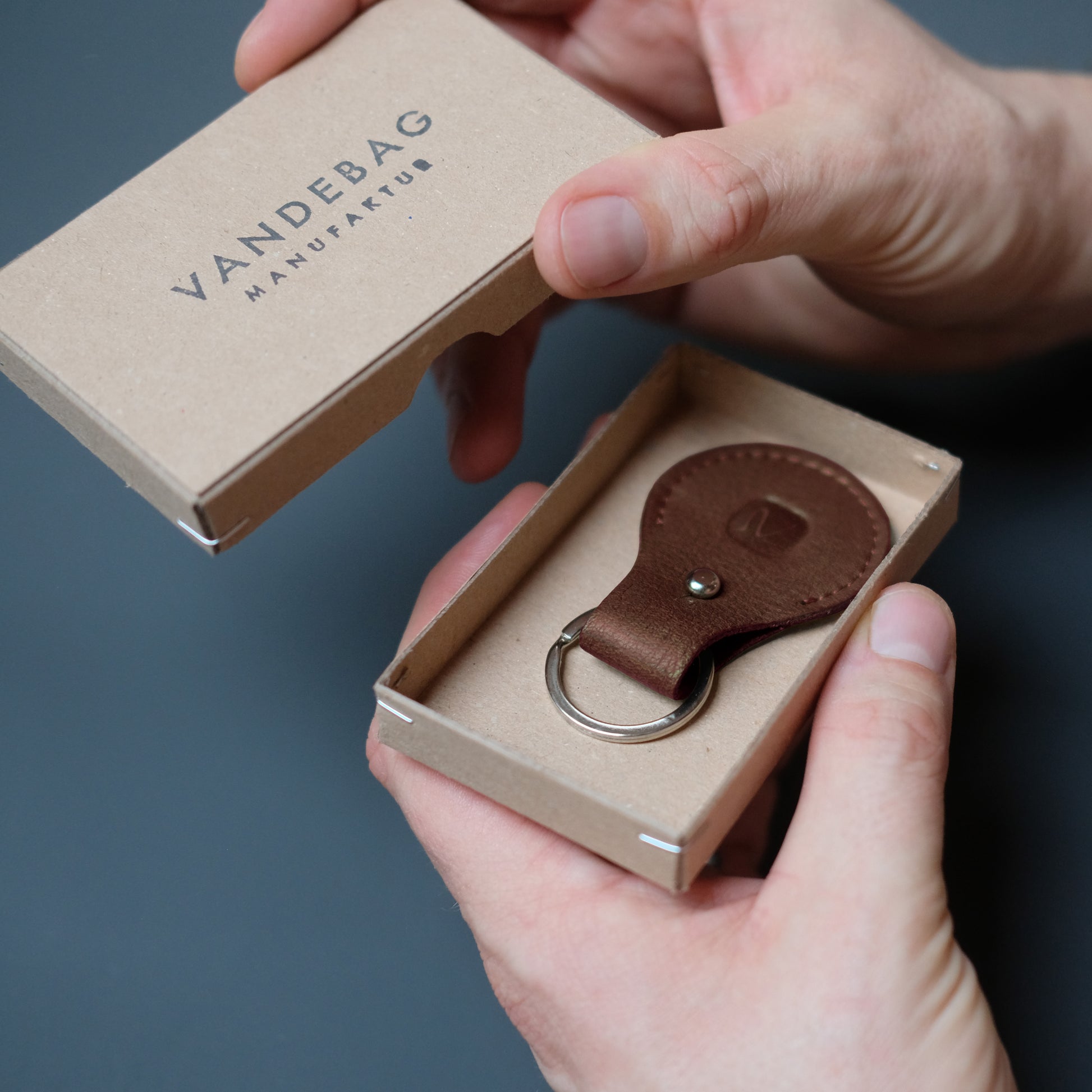 Der braune Airtag Anhänger ist ein tolles Geschenk und lässt sich mit einer Initialen Prägung noch weiter personalisieren - ein echtes Unikat, hochwertig und schön, handgefertigt in der VANDEBAG Manufaktur.